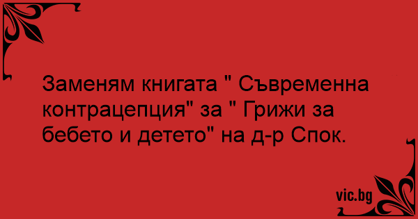 Заменям книгата " Съвременна контрацепция" за " Грижи за бебето и детето" на д-р Спок.