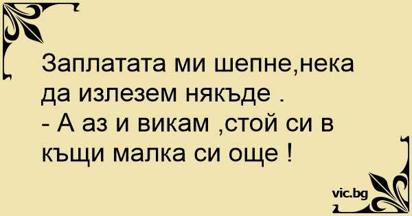Зарплата шепчет: Заплатата ми шепне,нека да излезем някъде .- А аз и викам ,стой си в къщи малка си още ! 0 0 0