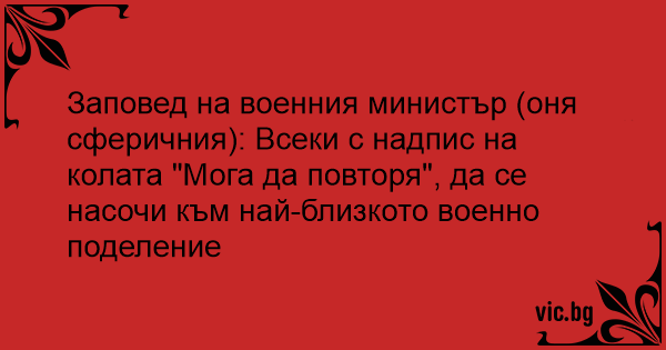 Заповед на военния министър (оня сферичния): Всеки с надпис на колата "Мога да повторя", да се насочи към най-близкото военно поделение