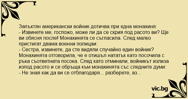 - Извинете ме, госпожо, може ли да се скрия под расото ви? Ще ви обясня после! Монахинята се съгласила. След малко пристигат двама военни полицаи: