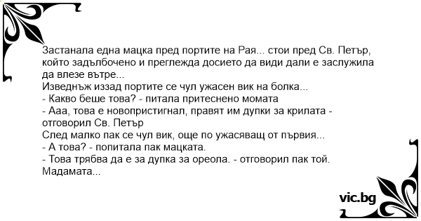 Застанала една мацка пред портите на Рая... стои пред Св. Петър, който задълбочено и преглежда досието да види дали е заслужила да влезе вътре...