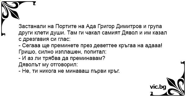 Застанали на Портите на Ада Григор Димитров и група други клети души. Там ги чакал самият Дявол и им казал с дрезгавия си глас:
