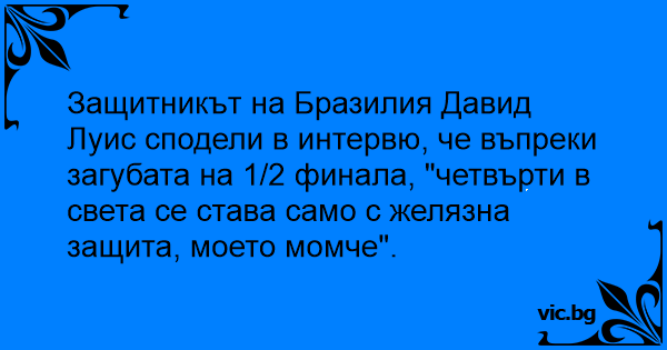 Защитникът на Бразилия Давид Луис сподели в интервю, че въпреки загубата на 1/2 финала, "четвърти в света се става само с желязна защита, моето момче".