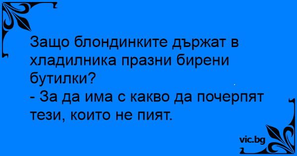 Waarom zet een dom blondje lege flessen voor een feest in de koelkast? Antwoord: Voor de gasten die geen dorst hebben