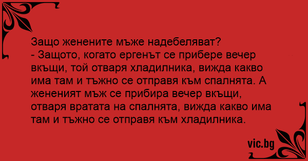 - Защото, когато ергенът се прибере вечер вкъщи, той отваря хладилника, вижда какво има там и тъжно се отправя към спалнята. А жененият мъж се прибира вечер вкъщи, отваря вратата на спалнята, вижда какво има там и тъжно се отправя към хладилника.