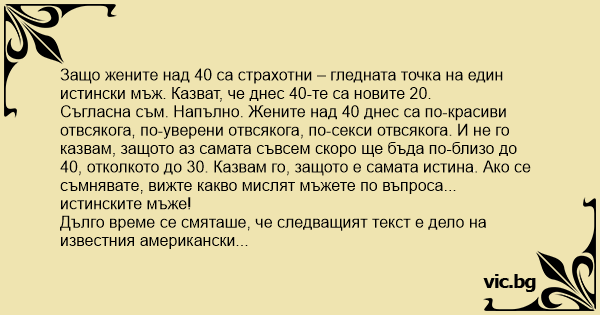 Съгласна съм. Напълно. Жените над 40 днес са по-красиви отвсякога, по-уверени отвсякога, по-cekcи отвсякога. И не го казвам, защото аз самата съвсем скоро ще бъда по-близо до 40, отколкото до 30. Казвам го, защото е самата истина. Ако се съмнявате, вижте какво мислят мъжете по въпроса... истинските мъже!