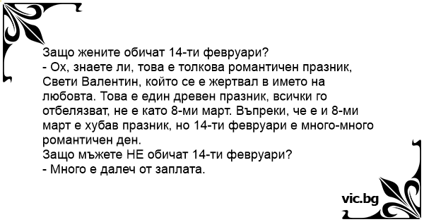 - Ох, знаете ли, това е толкова романтичен празник, Свети Валентин, който се е жертвал в името на любовта. Това е един древен празник, всички го отбелязват, не е като 8-ми март. Въпреки, че е и 8-ми март е хубав празник, но 14-ти февруари е много-много романтичен ден.