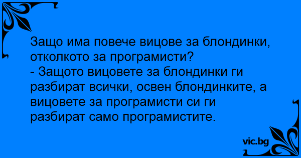 - Защото вицовете за блондинки ги разбират всички, освен блондинките, а вицовете за програмисти си ги разбират само програмистите.