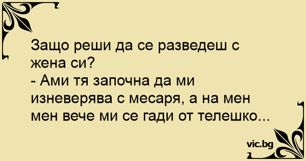 - Ами тя започна да ми изневерява с месаря, а на мен мен вече ми се гади от телешко...