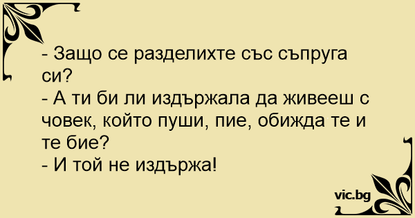 — Чула, ти розсталася з хлопцем. Чому? — А ти би змогла жити з людиною, яка палить, п’є, лається матом, та ще й б’ється? — Звичайно ні! — Ось і він не зміг.