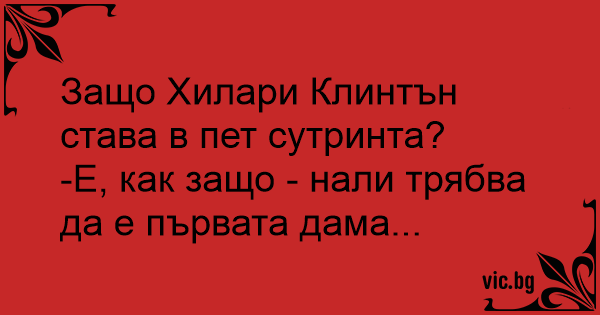 - Miksi Hillary Clinton herättää miehensä joka yö heti puolen yön jälkeen ja vaatii häneltä seksiä? - Hän haluaa olla päivän ensimmäinen nainen.