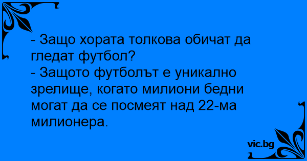 - Защото футболът е уникално зрелище, когато милиони бедни могат да се посмеят над 22-ма милионера.