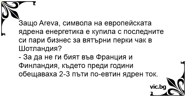 Защо Areva, символа на европейската ядрена енергетика е купила с последните си пари бизнес за вятърни перки чак в Шотландия?