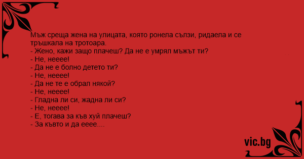 - Жено, кажи защо плачеш? Да не е умрял мъжът ти?
