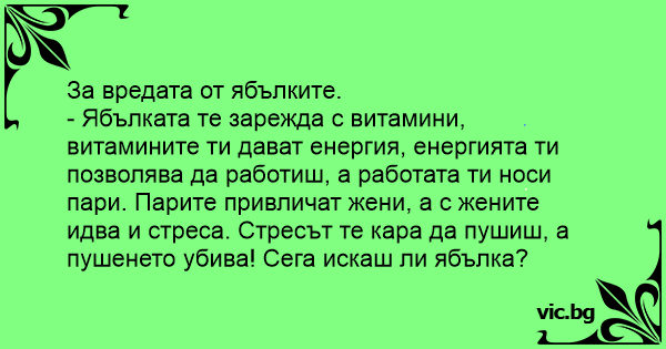 - Ябълката те зарежда с витамини, витамините ти дават енергия, енергията ти позволява да работиш, а работата ти носи пари. Парите привличат жени, а с жените идва и стреса. Стресът те кара да пушиш, а пушенето убива! Сега искаш ли ябълка?