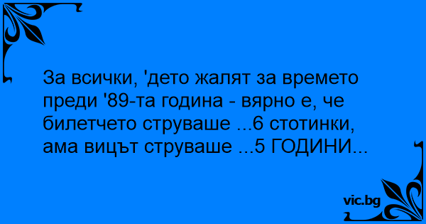 За всички, 'дето жалят за времето преди '89-та година - вярно е, че билетчето струваше ...6 стотинки, ама вицът струваше ...5 ГОДИНИ...