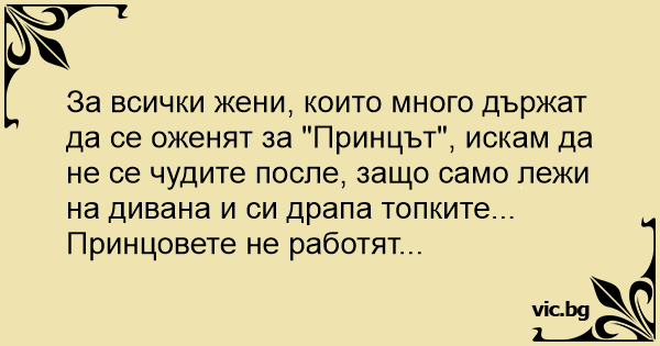 За всички жени, които много държат да се оженят за "Принцът", искам да не се чудите после, защо само лежи на дивана и си драпа топките...