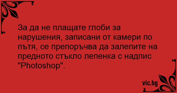 За да не плащате глоби за нарушения, записани от камери по пътя, се препоръчва да залепите на предното стъкло лепенка с надпис "Рhоtоshор".