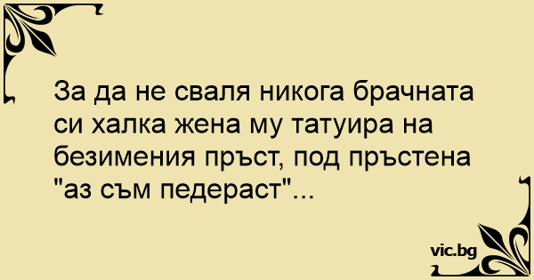 За да не сваля никога брачната си халка жена му татуира на безимения пръст, под пръстена "аз съм пeдepact"...<br />