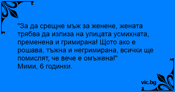 "За да срещне мъж за женене, жената трябва да излиза на улицата усмихната, пременена и гримирана! Щото ако е рошава, тъжна и негримирана, всички ще помислят, че вече е омъжена!"