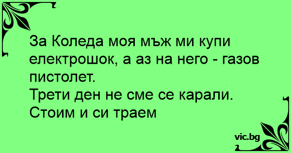 За Коледа моя мъж ми купи електрошок, а аз на него - газов пистолет.<br />Трети ден не сме се карали.<br />Стоим и си траем