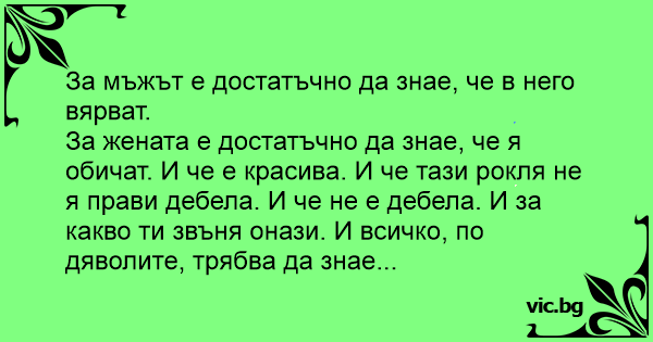 За жената е достатъчно да знае, че я обичат. И че е красива. И че тази рокля не я прави дебела. И че не е дебела. И за какво ти звъня онази. И всичко, по дяволите, трябва да знае...