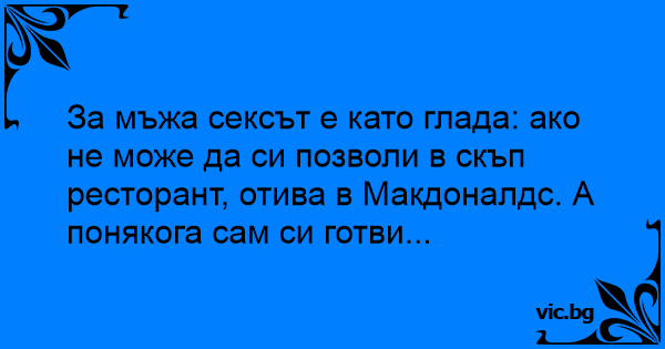 За мъжa cekcъt е като глада: aко не може да си позволи в скъп ресторант, отива в Макдоналдс. А понякога сам си готви...