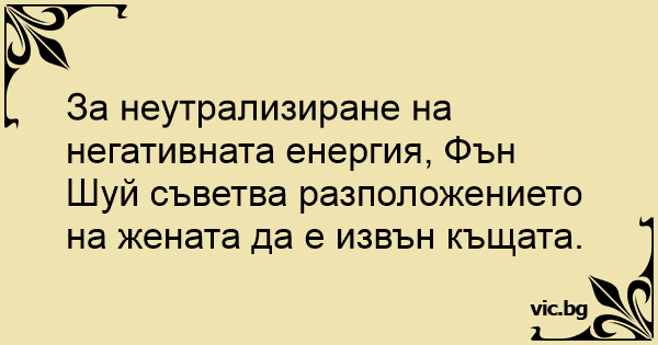 За неутрализиране на негативната енергия, Фън Шуй съветва разположението на жената да е извън къщата.