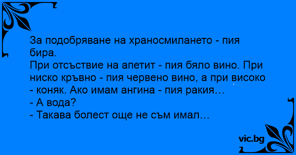 При отсъствие на апетит - пия бяло вино. При ниско кръвно - пия червено вино, а при високо - коняк. Ако имам ангина - пия ракия…
