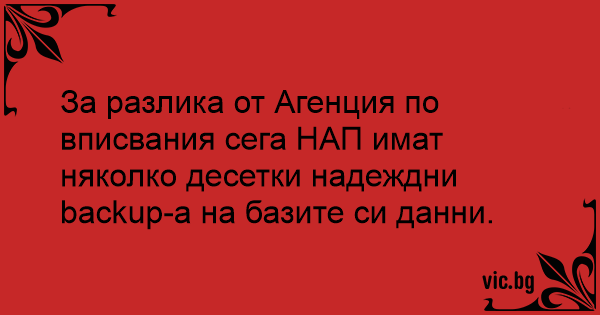 За разлика от Агенция по вписвания сега НАП имат няколко десетки надеждни backup-а на базите си данни.