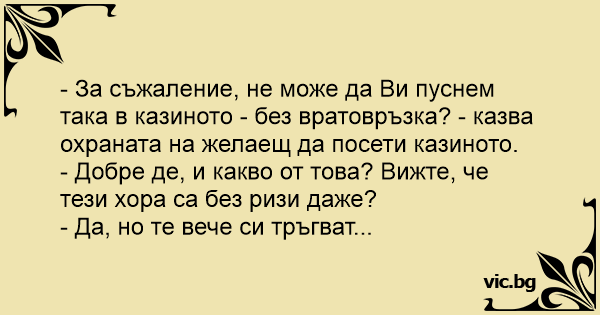 - За съжаление, не може да Ви пуснем така в казиното - без вратовръзка? - казва охраната на желаещ да посети казиното.
