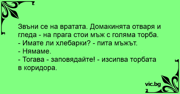 Звъни се на вратата. Домакинята отваря и гледа - на прага стои мъж с голяма торба.