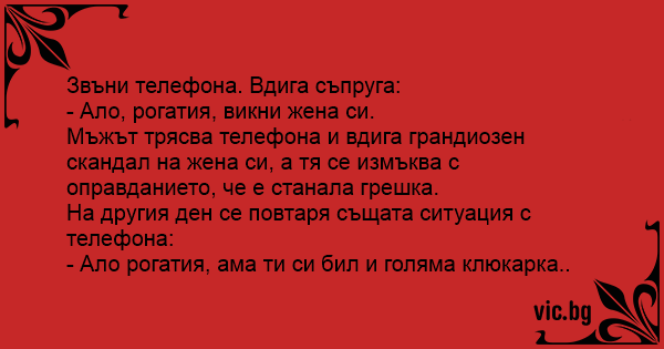 Звъни телефона. Вдига съпруга: