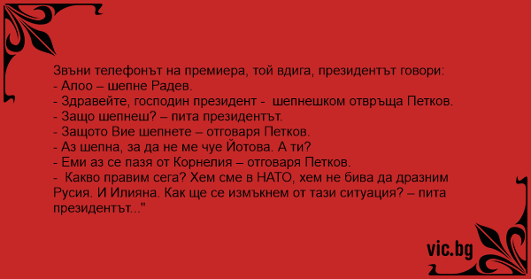 Звъни телефонът на премиера, той вдига, президентът говори: - Алоо – шепне Радев. - Здравейте, господин президент - шепнешком отвръща Петков. - Защо шепнеш? – пита президентът. - Защото Вие шепнете – отговаря Петков. - Аз шепна, за да не ме чуе Йотова. А ти? - Еми аз се пазя от Корнелия – отговаря Петков. - Какво правим сега? Хем сме в НАТО, хем не бива да дразним Русия. И Илияна. Как ще се измъкнем от тази ситуация? – пита президентът..."