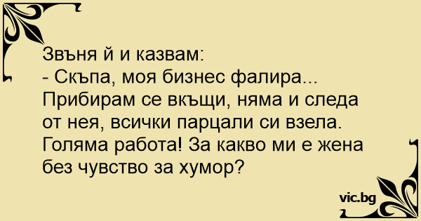 Прибирам се вкъщи, няма и следа от нея, всички парцали си взела. Голяма работа! За какво ми е жена без чувство за хумор?