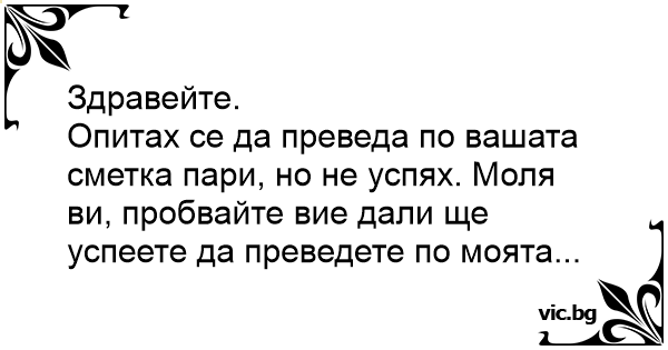 Опитах се да преведа по вашата сметка пари, но не успях. Моля ви, пробвайте вие дали ще успеете да преведете по моята...
