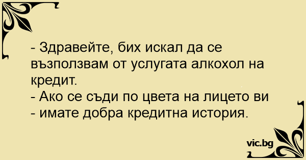 - Здравейте, бих искал да се възползвам от услугата алкохол на кредит. - Ако се съди по цвета на лицето ви - имате добра кредитна история.