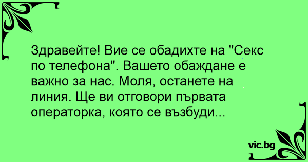 Здравейте! Вие се обадихте на "Cekc по телефона". Вашето обаждане е важно за нас. Моля, останете на линия. Ще ви отговори първата операторка, която се възбуди...