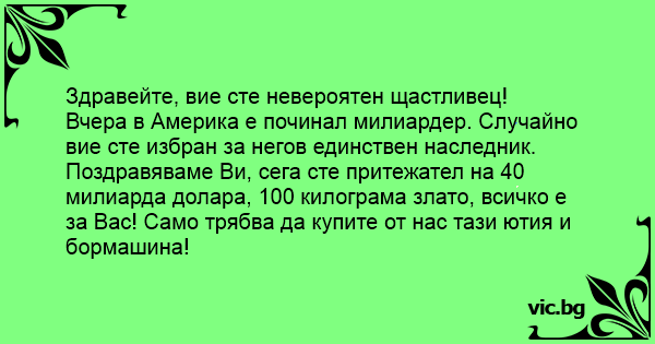Вчера в Америка е починал милиардер. Случайно вие сте избран за негов единствен наследник. Поздравяваме Ви, сега сте притежател на 40 милиарда долара, 100 килограма злато, всичко е за Вас! Само трябва да купите от нас тази ютия и бормашина!