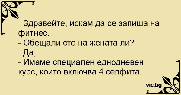Девојка оди во теретана: - Здраво, сакам да се запишам фитнес. - Новогодишна резолуција? - Да! - Добредојдовте, имаме еднодневни курсеви со 4 селфи!