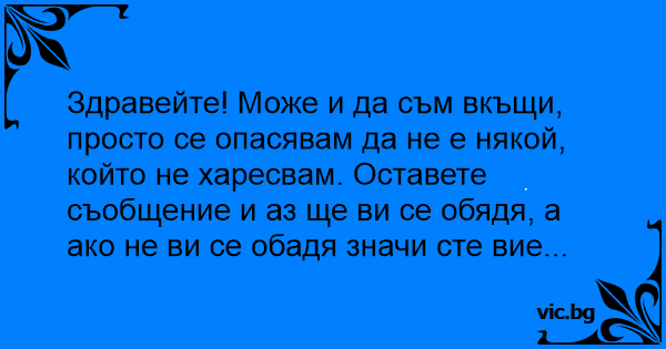 Здравейте! Може и да съм вкъщи, просто се опасявам да не е някой, който не харесвам. Оставете съобщение и аз ще ви се обядя, а ако не ви се обадя значи сте вие...