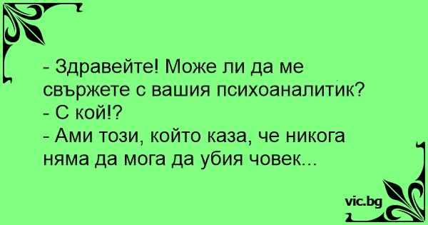 - Sveiki dakteri!Kur palika tas jūsu psihoanalītiķis? - Kurš? - Nu tas,kurš teica,ka es nekad cilvēku nespēšot nogalināt...