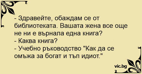 - Здравейте, обаждам се от библиотеката. Вашата жена все още не ни е върнала една книга?