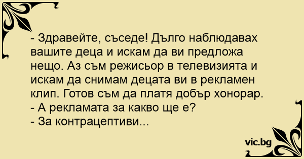 - Здравейте, съседе! Дълго наблюдавах вашите деца и искам да ви предложа нещо. Аз съм режисьор в телевизията и искам да снимам децата ви в рекламен клип. Готов съм да платя добър хонорар.