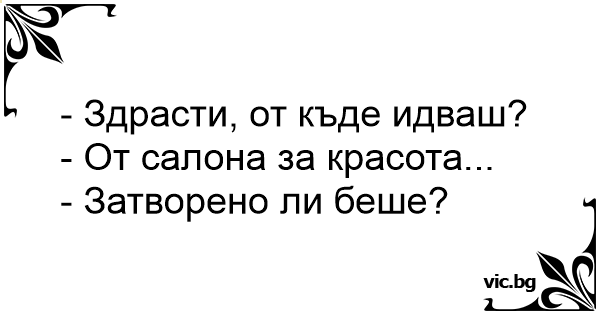 Зустрічаються дві подруги. — Привіт, ти де була? — Ходила до салону краси. — Ну і що, він закритий був?