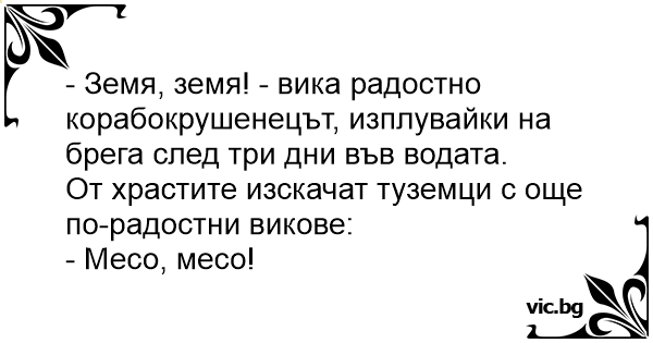 - Земя, земя! - вика радостно корабокрушенецът, изплувайки на брега след три дни във водата. От храстите изскачат туземци с още по-радостни викове: - Месо, месо!