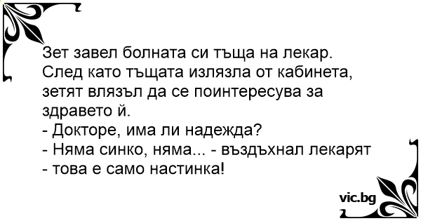 След като тъщата излязла от кабинета, зетят влязъл да се поинтересува за здравето й.