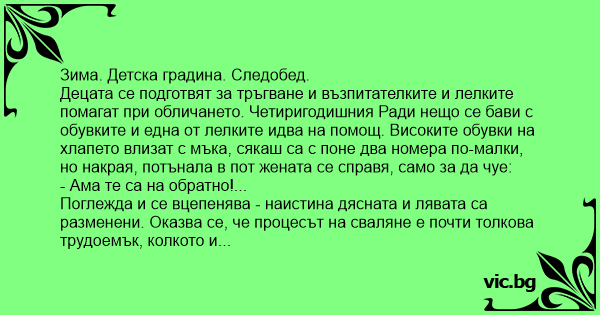Децата се подготвят за тръгване и възпитателките и лелките помагат при обличането. Четиригодишния Ради нещо се бави с обувките и една от лелките идва на помощ. Високите обувки на хлапето влизат с мъка, сякаш са с поне два номера по-малки, но накрая, потънала в пот жената се справя, само за да чуе:
