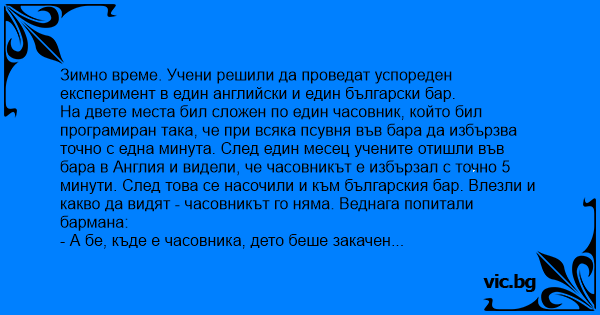 На двете места бил сложен по един часовник, който бил програмиран така, че при всяка псувня във бара да избързва точно с една минута. След един месец учените отишли във бара в Англия и видели, че часовникът е избързал с точно 5 минути. След това се насочили и към българския бар. Влезли и какво да видят - часовникът го няма. Веднага попитали бармана: