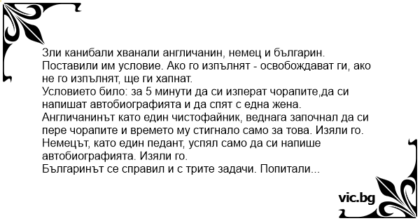 Зли канибали хванали англичанин, немец и българин. Поставили им условие. Ако го изпълнят - освобождават ги, ако не го изпълнят, ще ги хапнат.
